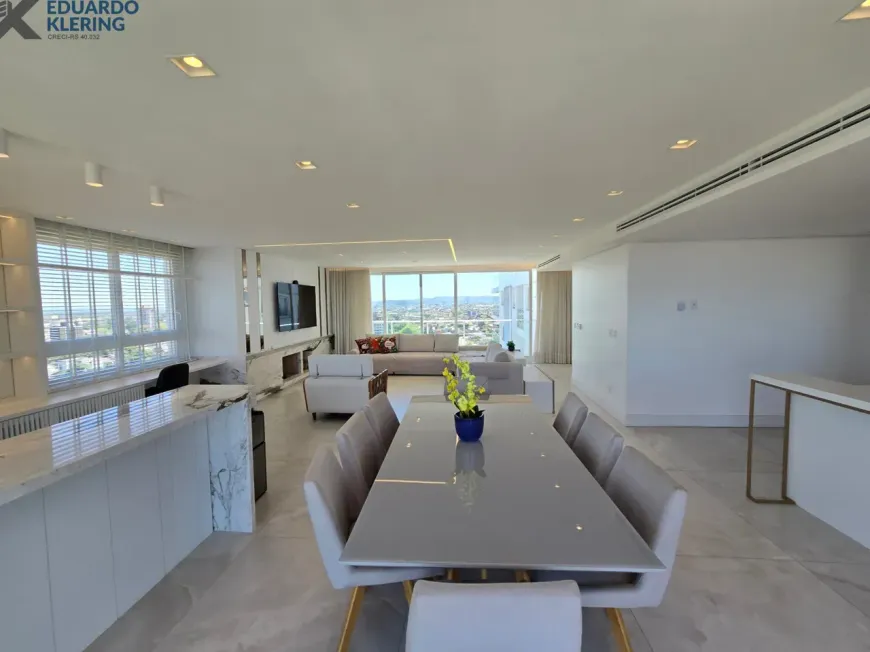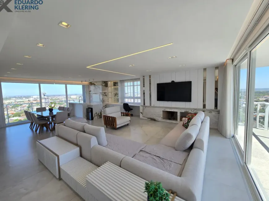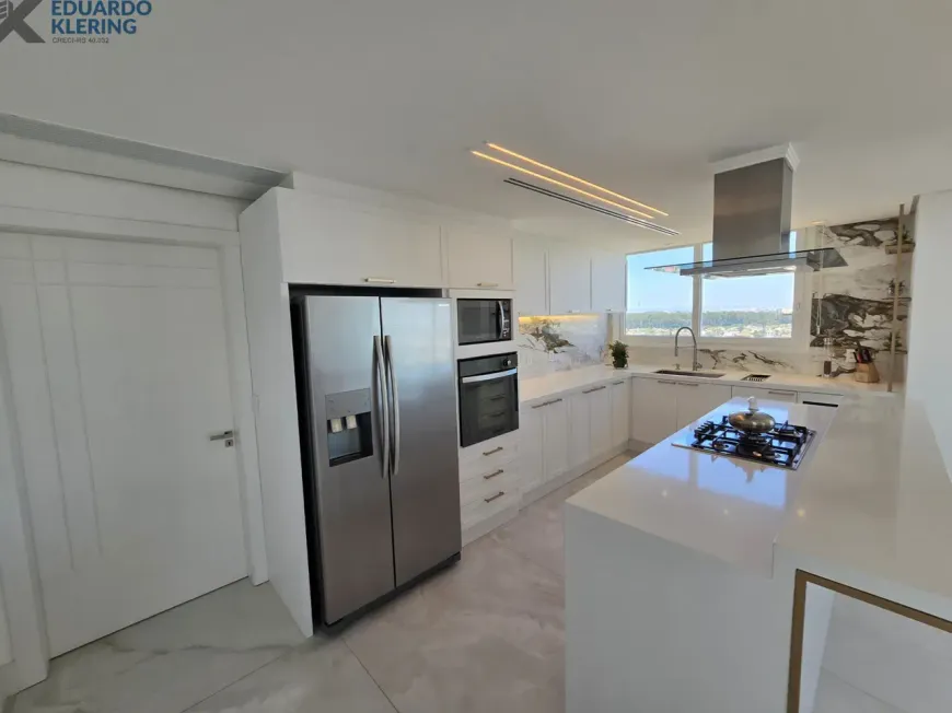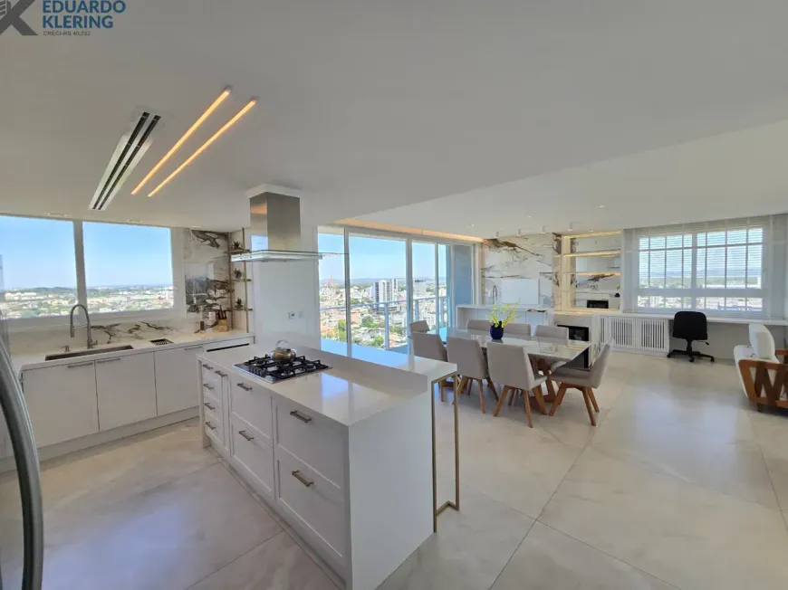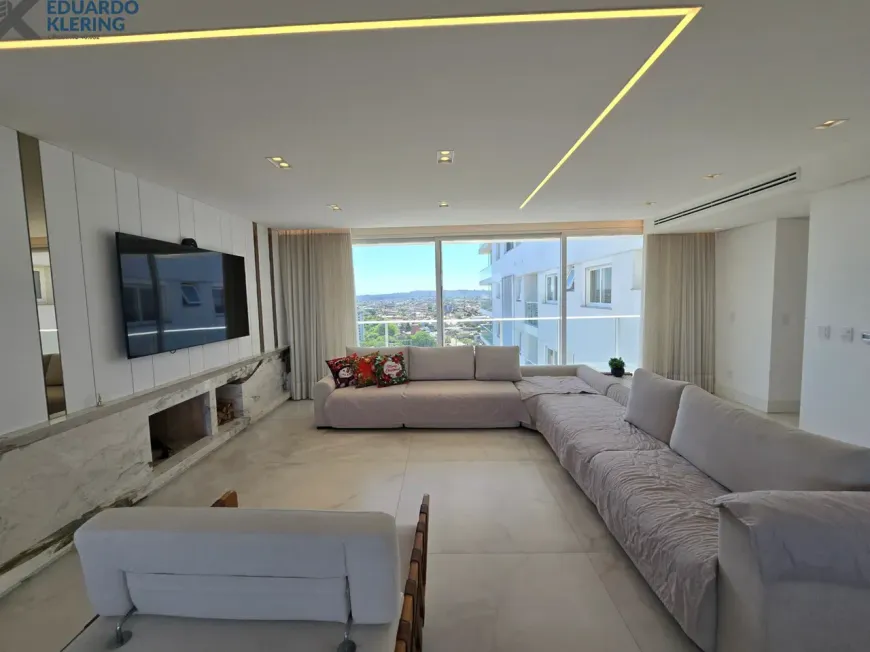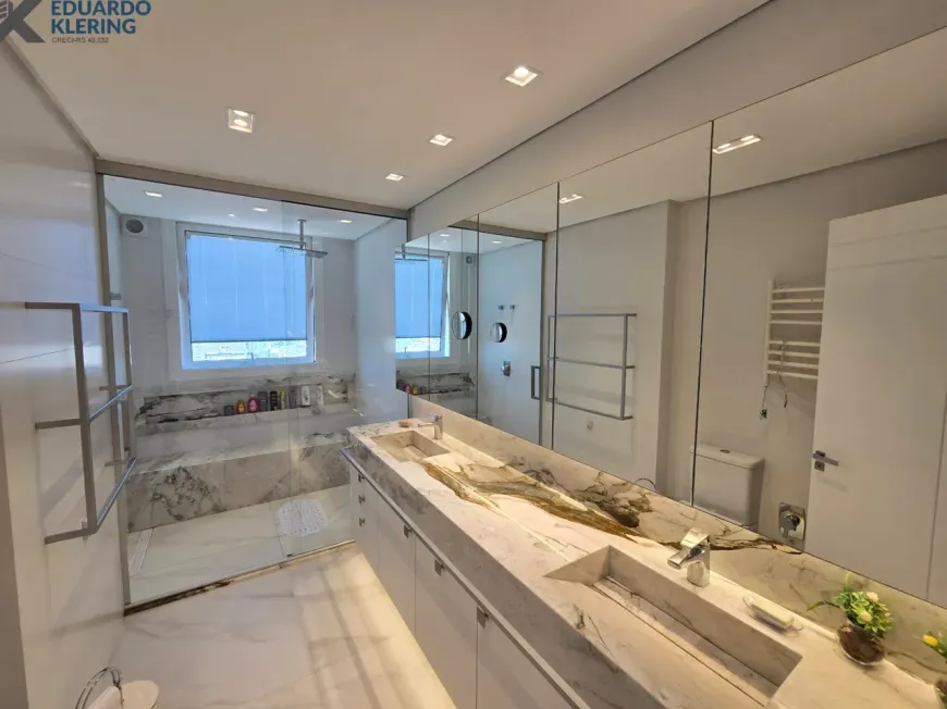 NOVIDADE! Extraordinária oportunidade de moradia neste amplo, lindo e exclusivo apartamento “padrão luxo” semimobiliado e equipado, com 3 suítes (principal com mais de 30m², closet, sacada e “espera” para hidromassagem), 4 banheiros e 1 lavabo (banho suíte com cuba dupla esculpida em pedra), 241,71m² privados, 362,54m² total, 16º andar, frente, orientação solar privilegiada (norte), linda vista arborizada de 270° e com maravilhoso pôr do sol, sacadas abertas, living amplo de quase 90m² com churrasqueira à carvão, lareira à lenha e muita iluminação natural, gostosa ventilação cruzada, cozinha em ilha e área de serviço independentes, depósito, sistema de climatização central, 4 vagas de garagem independentes (lado a lado) com depósito, revestimentos Classe A, materiais de primeira qualidade, piso porcelanato 120×120 nas áreas úmidas e sala (cozinha, área de serviço, depósito, banheiros e lavabo), piso laminado nos dormitórios e corredor, esquadrias da marca Weiku em PVC com perfil alemão e excelente conforto térmico e acústico, persianas com controle remoto nos dormitórios, medidores individuais, gás central, água quente, acabamento premium, laje plana maciça com alto desempenho acústico, entrada social com hall privativo. Imóvel quitado e regularizado, aceita financiamento. Essa é a oportunidade perfeita para quem privilegia espaço e privacidade, num imóvel de altíssimo padrão, onde você vai poder curtir um pôr do sol incrível no final de tarde, contemplar uma vista maravilhosa, num ambiente exclusivo, silencioso e bem ventilado. Aqui, com certeza, você também vai poder fazer um churrasquinho gostoso em família, degustar um bom vinho curtindo o aconchego da lareira acesa e compartilhar os bons momentos que a vida nos proporciona. É muita qualidade de vida com praticidade, conforto, lazer e segurança!
